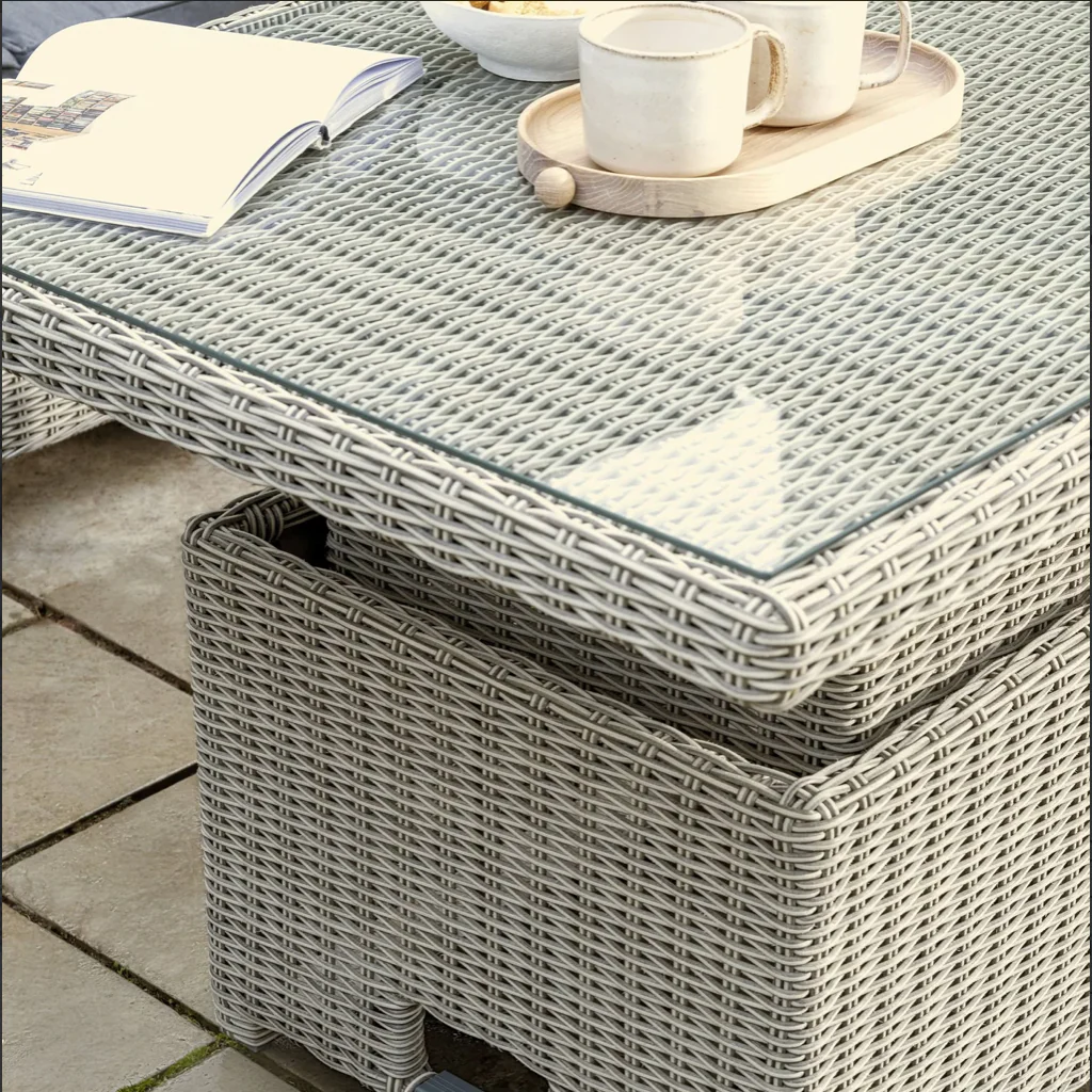 Room for everyone — this Palma Set includes a 3-seat sofa, 2 armchairs, and 2 stools, all with plush waterproof cushions for all-day comfort. Built on a tough aluminium frame with hand-woven rattan in a fresh whitewash finish, it’s stylish, durable, and seats up to 7. Pair it with the Palma High/Low Table — adjustable from coffee to dining height in glass or slat top options — for the ultimate versatile garden setup. Limited stock only.