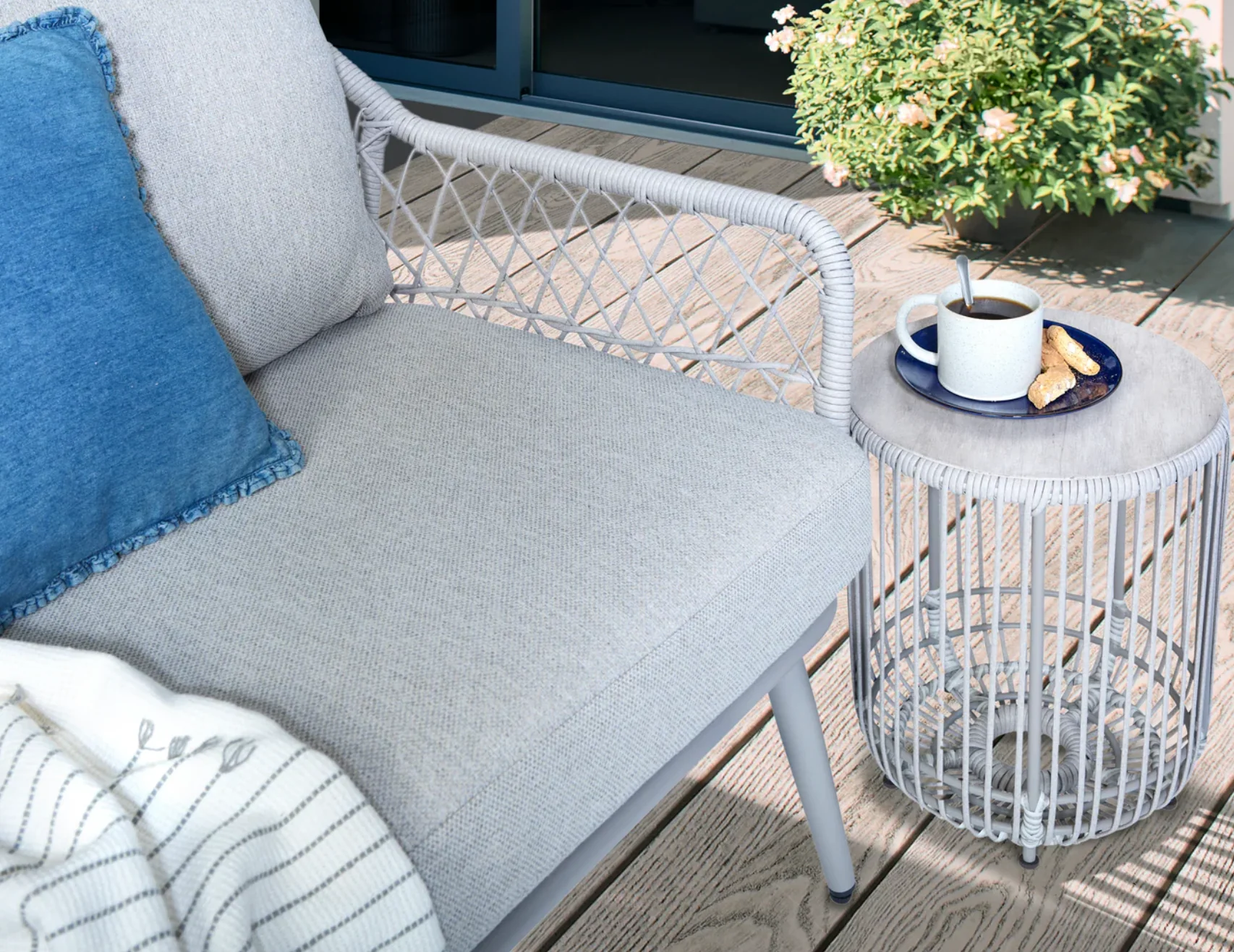 The Toulon 2 Seater Sofa and 2 Chairs brings comfort and style to your garden. With a tough aluminium frame, weatherproof rope, and plush cushions, it’s built to last. The sleek coffee table and side table with heat-transfer finish add a modern touch and wipes clean with ease. Perfect for relaxing with family or entertaining friends — Be quick, as stock won’t be around forever!