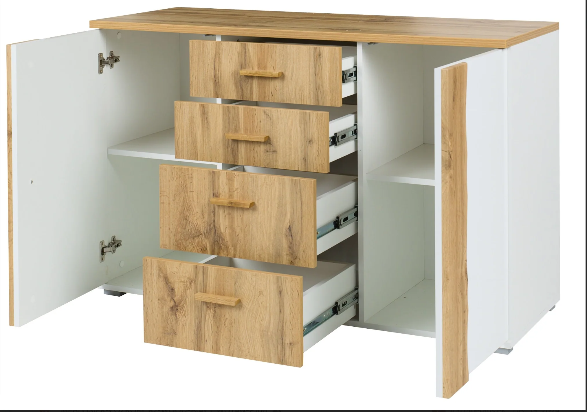 The Wood Chest of Drawers blends alpine white with oak Wotan for a natural, modern look. With 2 cupboards and 4 drawers, it offers generous storage for clothes, accessories, or home essentials. Stylish and practical for any room.